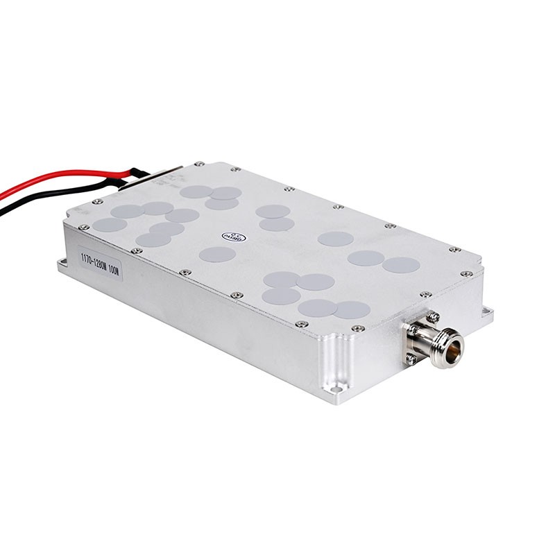 Ten moduł antydronowy to bezprzewodowy moduł częstotliwości radiowej, który działa w zakresie częstotliwości 1170-1280 MHz i ma moc wyjściową do 100 W. Można go używać w różnych sytuacjach, które wymagają bezprzewodowej transmisji sygnału o dużej mocy lub zakłóceń, szczególnie w systemach przeciwdziałania dronom.