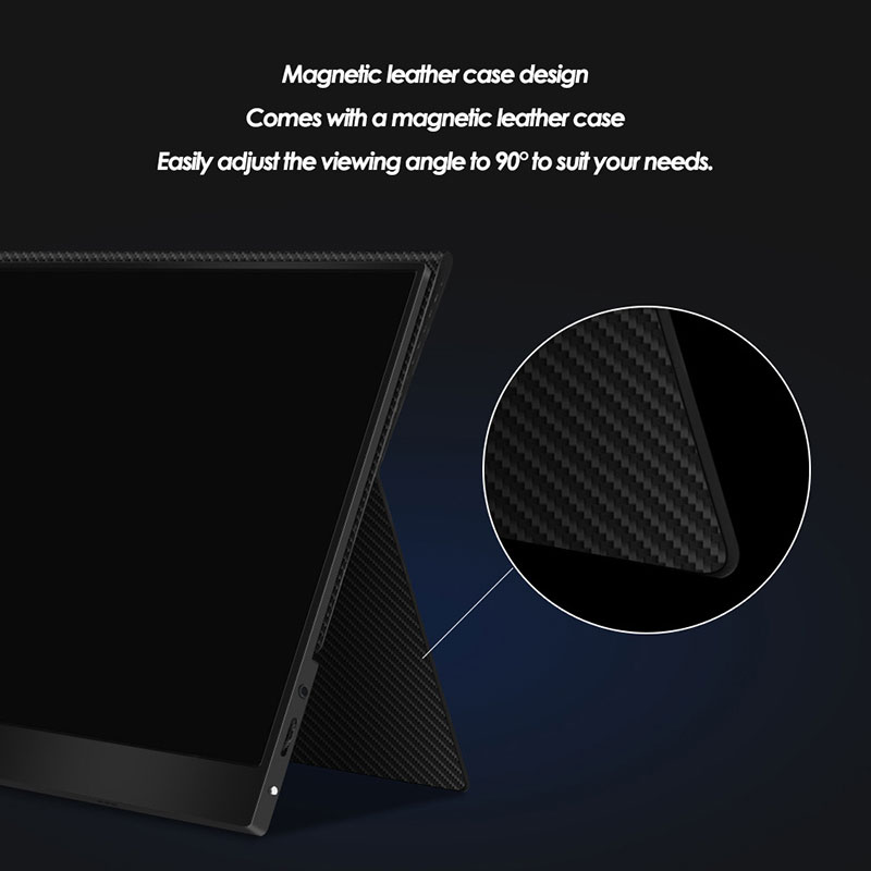 Wyposażony we wbudowane podwójne głośniki, oferuje dźwięk bez dodatkowych akcesoriów. Łączność obejmuje MiniHDMI, Type-C i gniazdo słuchawkowe 3,5 mm. Monitor jest lekki (720 g) i smukły (0,9 cm), dzięki czemu jest przenośny. Dla dodatkowej wygody jest wyposażony w magnetyczną skórzaną osłonę i wielofunkcyjny przycisk pulsatora.